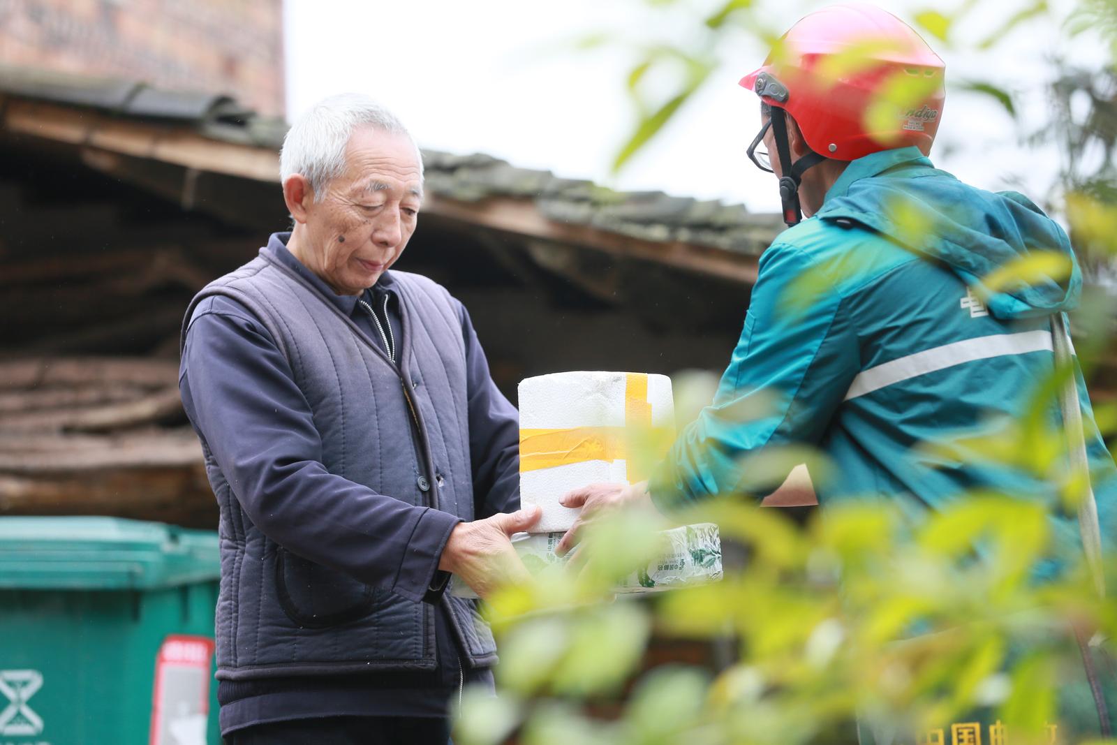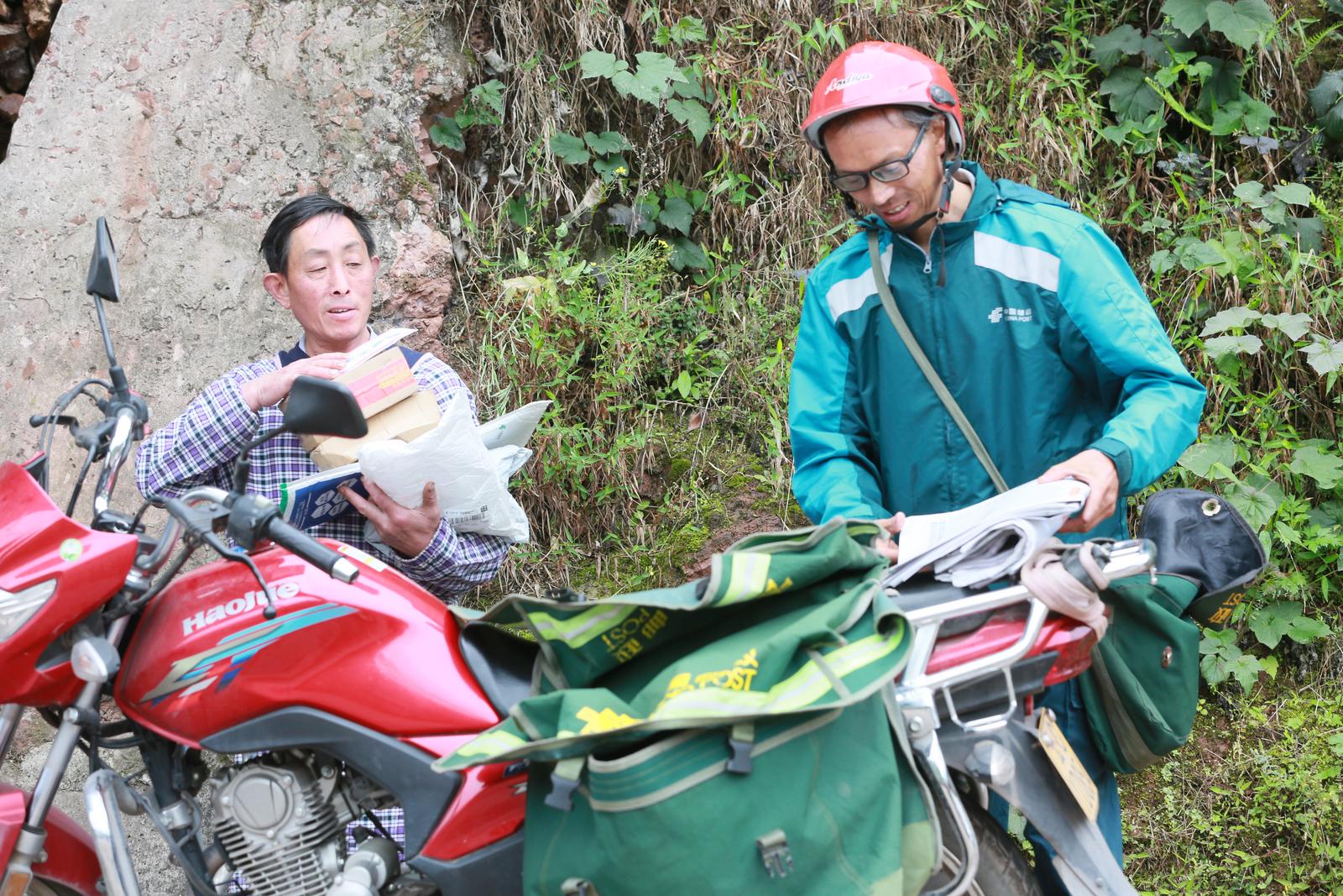 杨胜义(右)将包裹送到村民手中。