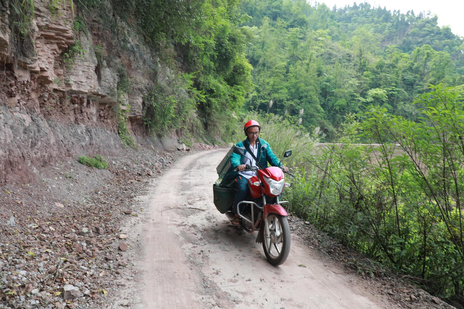 杨胜义骑着摩托车行驶在崎岖的山路上。